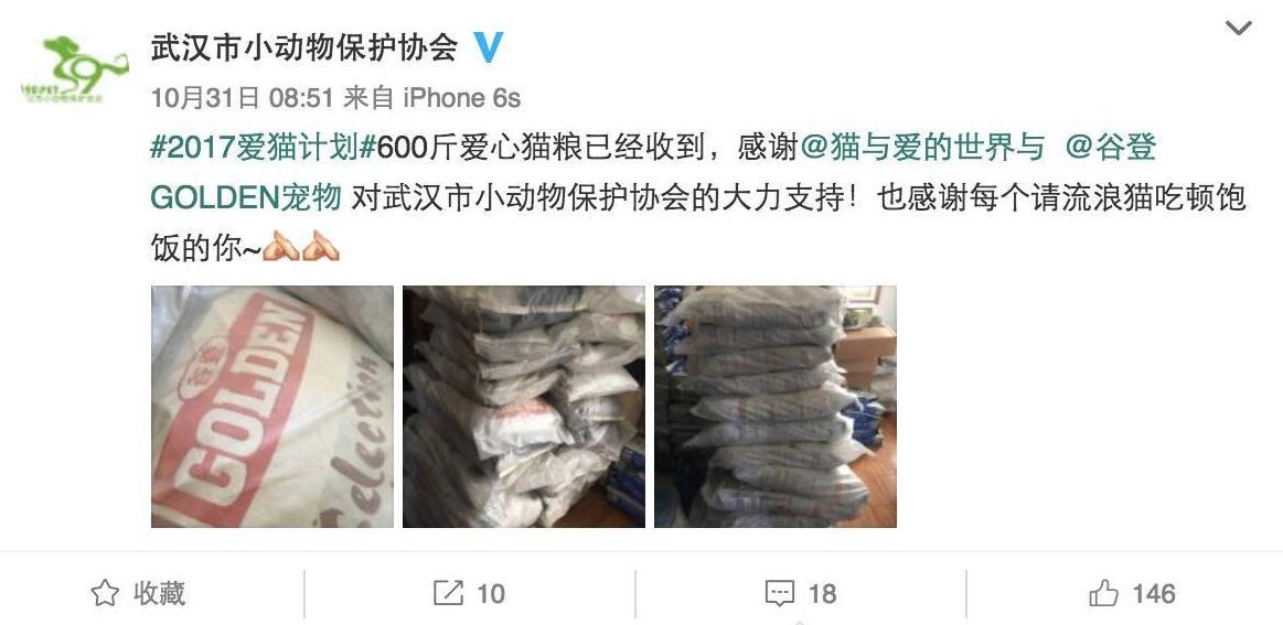 1. 武汉市小动物保护协会,成功收到猫粮600斤。