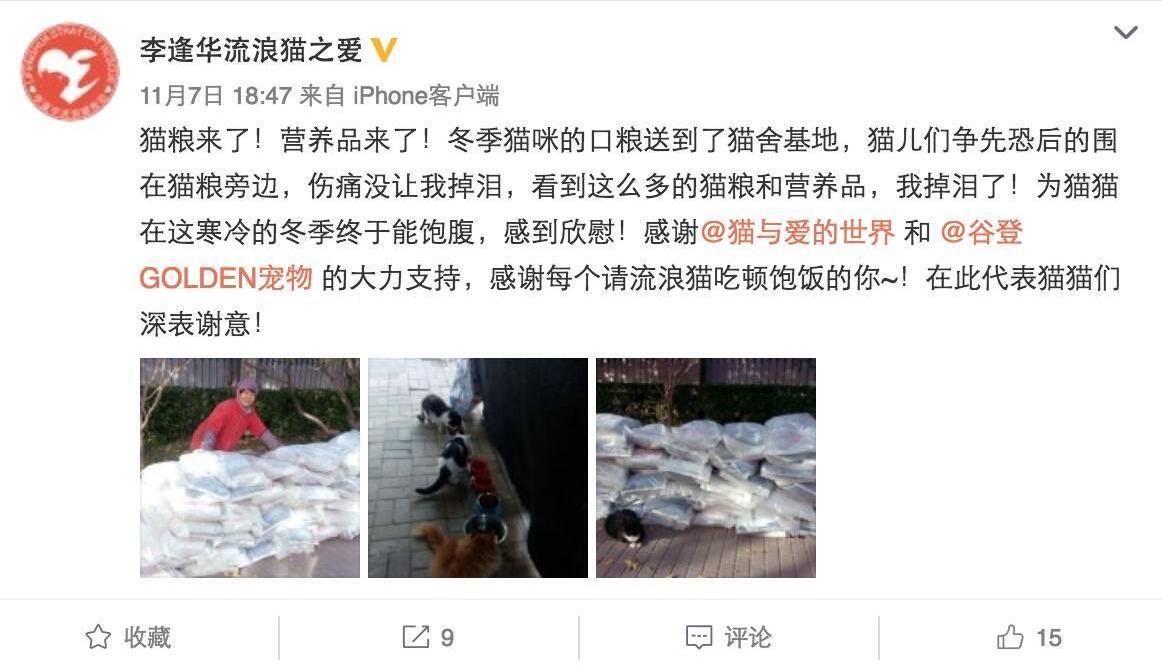 2. 李逢华宠物救助,成功收到猫粮1000斤。