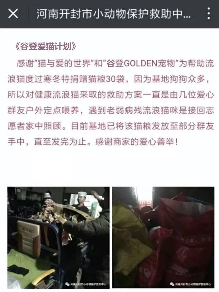 3. 河南省开封市小动物保护救助中心,成功收到猫粮600斤。