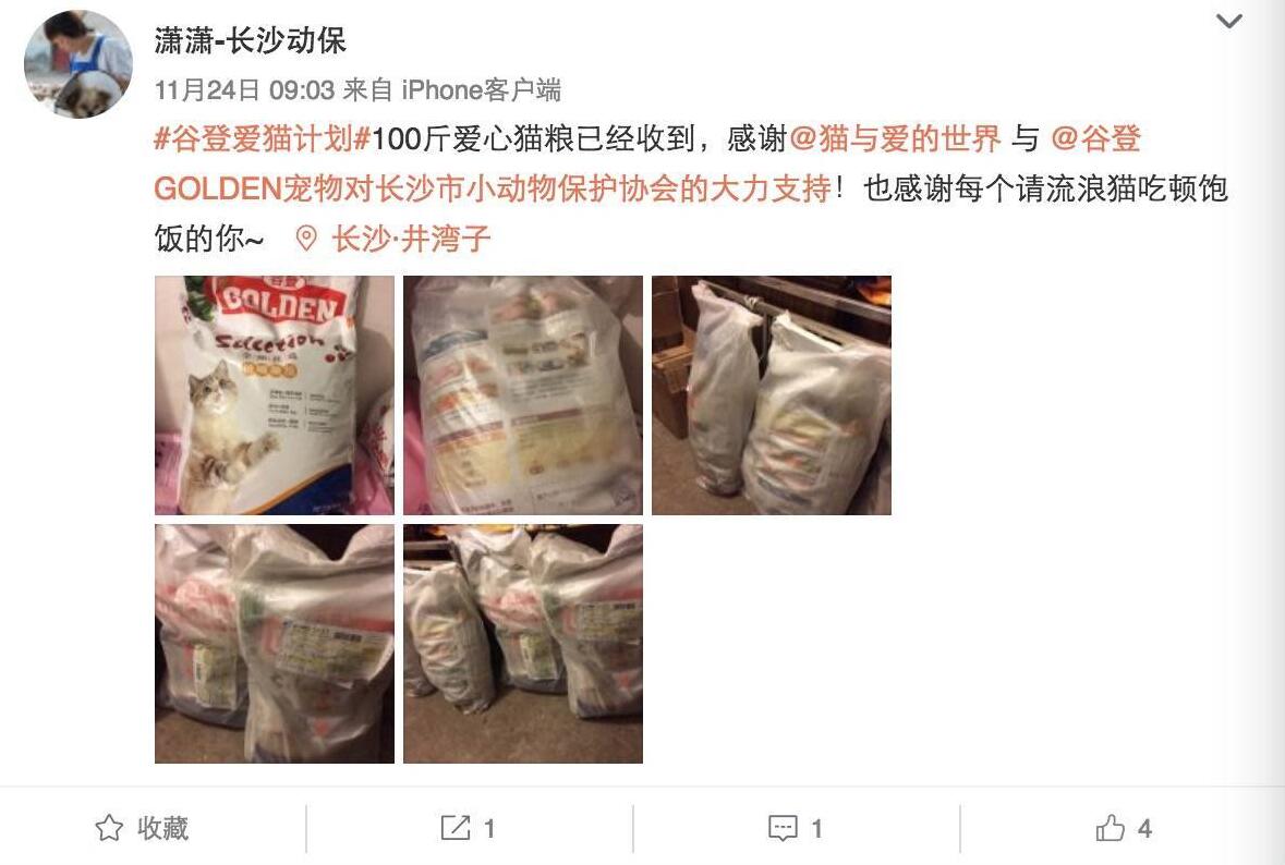 4. 长沙市小动物保护协会,成功收到猫粮100斤。