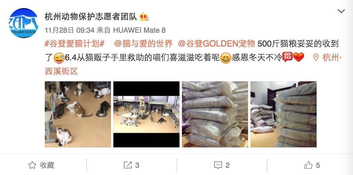 6. 杭州动物保护志愿者团队,成功收到猫粮500斤。