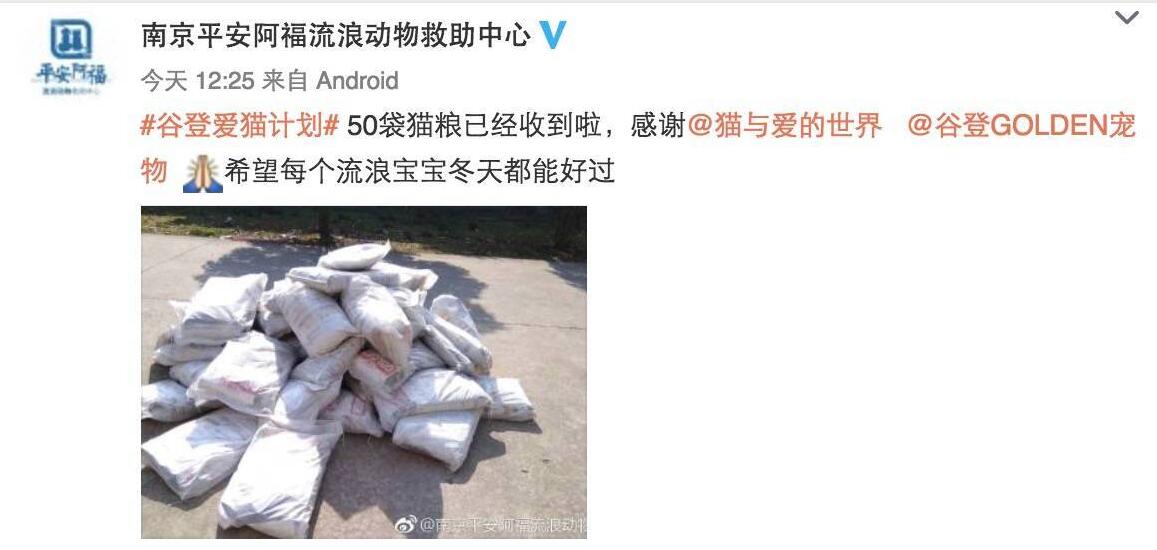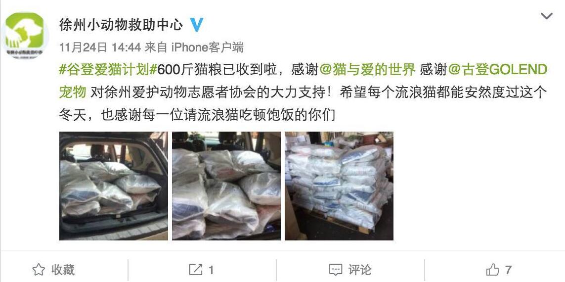 12. 徐州小动物救助中心,成功收到猫粮600斤。