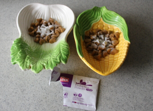 11月12日早上,开始给我家大T和小T试食,因为从来没有给牠们吃过这些东西,不懂怎样给牠们吃,也不知道牠们可愿意吃。为了不浪费所以我把一包谷登猫用六种菌分为两份,放在两碗猫粮上一人一半,给我家的大。T和小T吃。