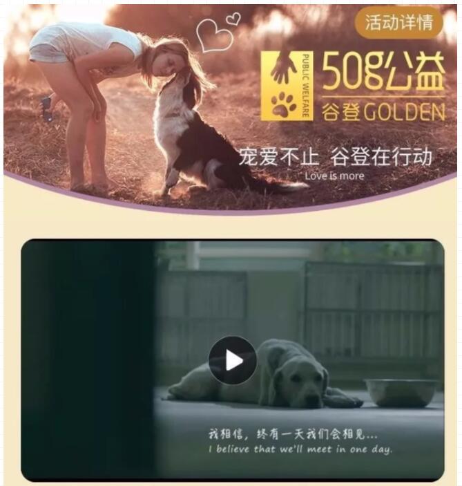 谷登GOLDEN自2018年6月1日倡导发起的“50g公益”活动,旨在长期帮助流浪动物。活动获得了百万人关注,数十万人次转发,十几万人次参与。截至目前,谷登已经向流浪动物捐赠519,530,0g公益宠粮,已有17318只流浪动物得到了帮助。