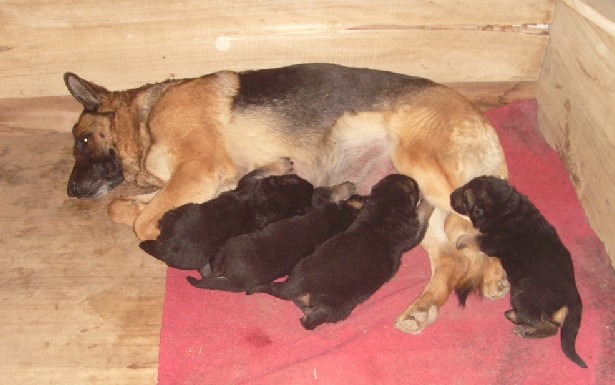 通常在生产后30天至第40天左右的时候,母犬就会渐渐厌烦喂乳,此时母乳的分泌会急速减少,尤其在一胎幼犬数量较多时更会加剧母犬的厌烦。德国牧羊犬母犬的乳房通常是左右各五个,一共十个,少数只有八个或少于八个的。靠后的几个乳房分泌量较多,因此应该适度施以人工干涉,让幼犬交 换吸吮各个乳房,以保证每一只吸乳量平均,发育较差的犬应多吸食分泌量较大的乳房。