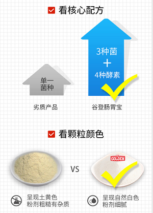 其次,谷登新型肠胃宝益生菌护肠、保胃一个都不少!菌源法国进口,铁达包被国际专利,更耐高温、耐胃酸。与酵素协同作战,复合配方相比单一配方肠胃宝更高效!
